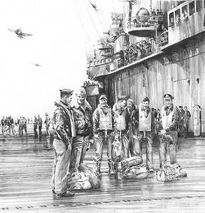 A rare and highly sought after "historical" edition of Into the Teeth of the Wind by Robert Taylor. This edition commemorates the famous raid on Japan led by General Jimmy Doolittle and includes the companion print "The Day Now Dawns" taken from Robert Taylor's pencil sketch. Bound for Tokyo, Lieutenant-Colonel Jimmy Doolittle launches his B-25 Mitchell from the heaving deck of the carrier USS Hornet on the morning of 18 April, 1942. It was a simple plan with a single objective, yet impossibly difficult and fraught with danger at every step. Within four short months of the infamous attack on Pearl Harbor, the USS Hornet would sail to within range of the Japanese coast and launch sixteen heavily-laden B-25 bombers, never previously flown off the deck of a carrier, to make a daring strike against major Japanese cities. With each aircraft weighed down by a ton of bombs and fuel to fly 2400 miles, take-off would be marginal; landing a twin engine bomber back on the short deck, impossible. The crews would have to fly on towards China and make the best they could of survival. At 8:00am on the morning of 18 April, 1942 Admiral Halsey flashed a message to Hornet to launch aircraft; the klaxon aboard ship boomed "Army pilots, man your planes!" In worsening weather, and with mountainous waves sending spray over the bow, Hornet’s deck was a hive of activity as the crews ran to their aircraft. 8y 8:20, with engines warmed and magnetos checked, mission leader Lieutenant-Colonel Jimmy Doolittle gave the thumbs-up to the deck launching officer. Releasing brakes, he pushed the throttle levers to the stops, and gunned his heavy bomber towards the heaving bow of the ship, timing his run to coincide with maximum pitch of the deck. The B-25 became airborne with feet to spare. Inspired by his many meetings with survivors of the raid, Robert Taylor has created a wonderfully faithful recreation of the scene as Jimmy Doolittle lifts his heavily laden B-25 off the deck. Fifteen gallant crews, with engines turning, are lined up and ready to follow. These gallant "Doolittle Tokyo Raiders" struck the first blow to the very heart of the Japanese Empire, putting fear into the minds of the nation's leaders, causing the Japanese to divert aircraft and equipment from offensive operations to the defence of their homeland. A tiny raid by the standards of what was to come, but massively important in the context of the war in the Pacific. This impressive and historical edition has been signed by 13 of the famous Doolittle Raid; Lieutenant Colonel Richard E Cole Major Thomas C Griffin Master Sergeant Edwin W Horton Jr Major General David M Jones Staff Sergeant David J Thatcher 2nd Lieutenant William L Birch Colonel William M Bower Lieutenant Colonel Robert L Hite Lieutenant Colonel Frank A Kappeler Tung-Sheng Liu (Chinese civilian who helped one of the crews to safely and became an honorary Doolittle Raider) Lieutenant Colonel Chase J Nielson Captain Charles J Ozuk Jr Master Sergeant Edward J Saylor Edition: 300 Main Image Size: 30 x 23 inches overall including borders We have only one of these available.