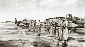 Jet Hunters by Robert Taylor. This Pilots Edition is supplied with the matching numbered Companion Print, "Black November Day", taken from a Robert Taylor drawing of Walter Nowotny's Me262. As the war in mainland Europe entered its final, bloody phase, the German Armies defending Berlin fought on with a savage, yet hopeless determination, slowly disintegrating before the mighty weapon of war unleashed against them. What remained of the Luftwaffe was mercilessly pounded from the air, their airfields hammered relentlessly. Aircraft, fuel, spare parts, ammunition and pilots were all in short supply but still they fought on in defence of the Reich. And pivotal in this bitter struggle were the highly advanced jet fighters of the Luftwaffe, and in particular the legendary Me262. Determined to obliterate the Luftwaffe jets once and for all, on 10 April 1945 just over thirteen hundred bombers attacked the airfields in force; but the jet fighters were already airborne, and waiting. As the bomber stream turned and slowly headed west for home, a powerful unit of nearly fifty Me262s pounced on them from the rear, out of the high cirrus clouds. Suddenly the clear air was alive with cannon fire as the Luftwaffe jets screamed into the attack. It was a desperate gamble and a few Fortresses in the outer elements were quickly hit before the ever alert, escorting P-51 s could join the fray and dive on the jets in hot pursuit. Once again Robert Taylor has created a powerful reconstruction of events as they happened that day, and it is easy to see why he has become the unrivalled master of aviation art. With seemingly effortless skill he portrays the B-17s of the First Air Division with the sun glinting on their fuselages and streaming contrails in the cold clear air as they turn for home. Several Me262s have already torn through the massed formation, but even as they look to escape from the wrath of the Fortresses' gunners, a P-51 from the escorting 356th Fighter Group has quickly spotted his target and presses home his attack. The hunter becomes the hunted as the Mustang pilot, Wayne Gatlin, skilfully positions himself behind the Me262 ready for the kill, one of a score of Luftwaffe jets downed in the encounter by the men of the Eighth. Limited "Pilots" Edition is signed by the following veteran pilots: Major General WAYNE C. GATLIN - on 10 April 1945 he destroyed the Me262 jet portrayed in the main painting immediately damaging another. Squadron Leader JUREK MENCEL - downed an Me262 whilst flying a Mustang III on 9 April 1945. Colonel JOE PETERBURS - shot down the Me262 of Walter Schuck, on the 10th April, 1945. Lieutenant Colonel DON CUMMINGS Colonel ART JEFFREY Captain WAYNE L. COLEMAN Lieutenant Colonel HUIE LAMB The companion drawing is additionally signed by five of the Luftwaffe’s iconic Me262 pilots: Major ERICH RUDORFFER - JG7 with 12 victories in the jet – 222 victories in total. Oberleutnant WALTER SCHUCK - JG7 with 8 victories in the jet – 206 victories in total. Major HANS-EKKEHARD BOB - EJG2 & JV44 – 60 victories in total. Feldwebel ERNST GIEFING - JG 7 with 2 victories in the jet – 6 victories in total. Leutnant NORBERT HANNIG - JG7 – 42 victories in total. Edition: 200 Pilot's Edition Main Image Size: 35 x 25 inches overall including borders. Companion print size: 25.5 x 17.5 inches overall.